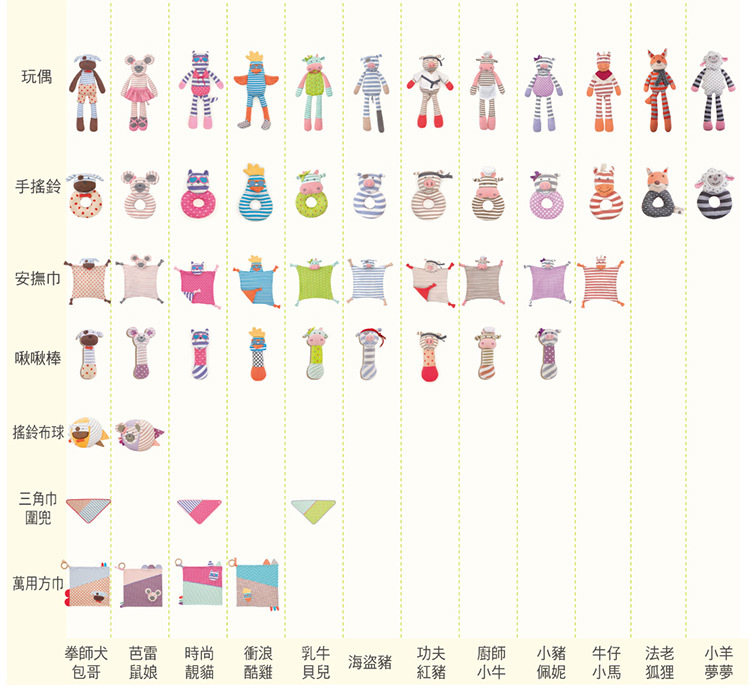 Apple Park 賦予農場動物各種職業,製作成可愛逗趣的農場好朋友系列安撫玩偶,並貼心設計長長的玩偶手臂,讓孩子方便抓握打結,感受不同形狀帶來的觸感差異。搖晃它,可發出沙沙聲響,吸引寶寶注意、轉移寶寶不安的情緒、給予安全感。