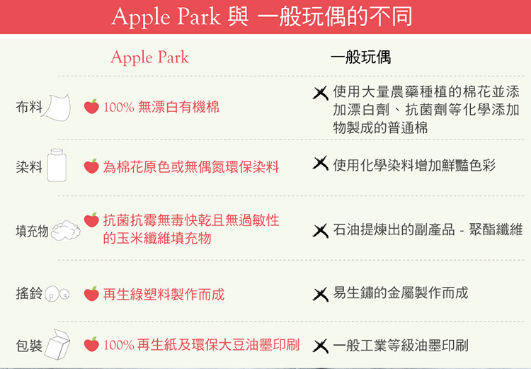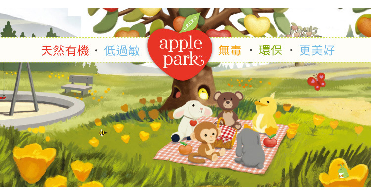 我們所生產的產品皆採用100% 有機棉與天然抗菌、抗霉、無毒、快乾且無過敏性的玉米纖維手工縫製完成,耐用且絕不含有毒化學物質!Apple Park 只讓寶寶享受最好、最天然的產品!