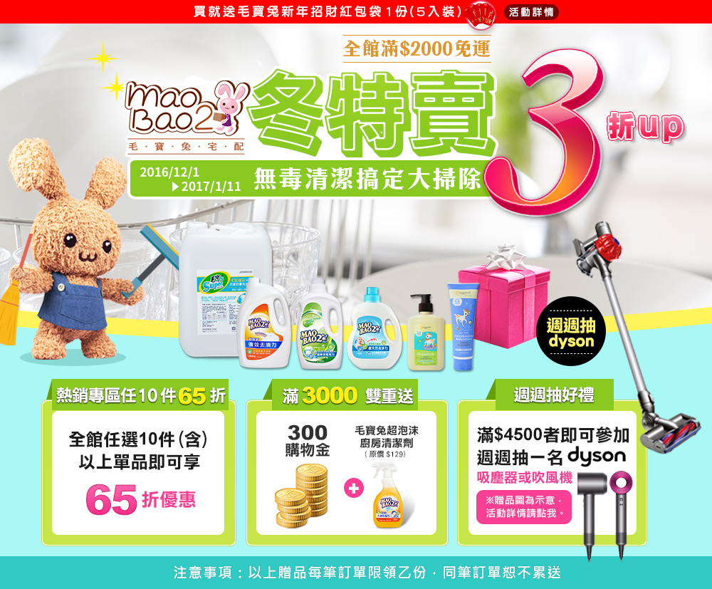 | 。單筆訂單滿$3,000元送「毛寶兔超泡沫廚房清潔劑」乙瓶(市價$129) |