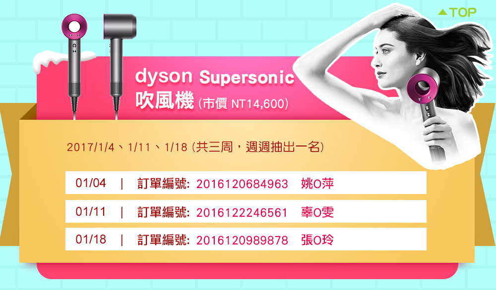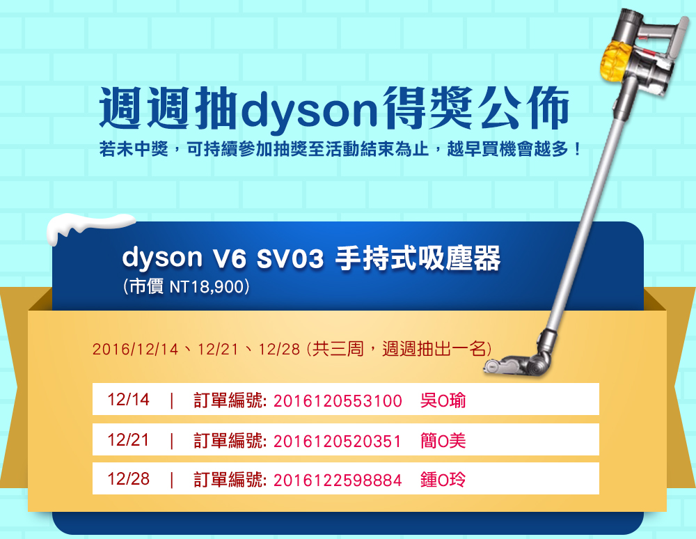 | 5.獎項:抽獎日期1-3周為dyson V6 SV03手持式吸塵器;4-6周為Dyson Supersonic吹風機 |
