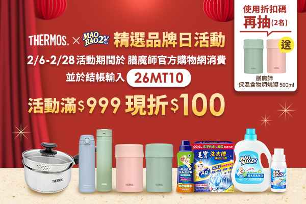 【活動時間】2026/2/6(五)-2/28(六) 【活動內容】1. 活動期間於膳魔師官方購物網消費,並於結帳時輸入【26MT10】滿$9...