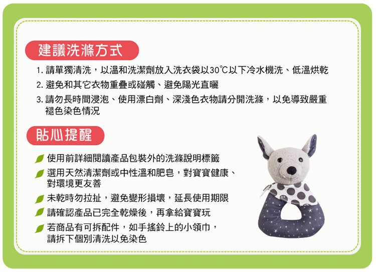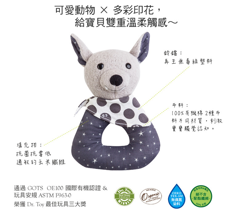 可愛的動物玩偶搭配細緻多彩的印花環形搖鈴、脖子上還繫了一條可拆卸的小領巾,不僅吸引寶寶注意,也給予視覺刺激;動物頭部和抓握的環形部分採用不同材質製作而成,給寶寶觸覺刺激,感受多重材質帶來的差異。