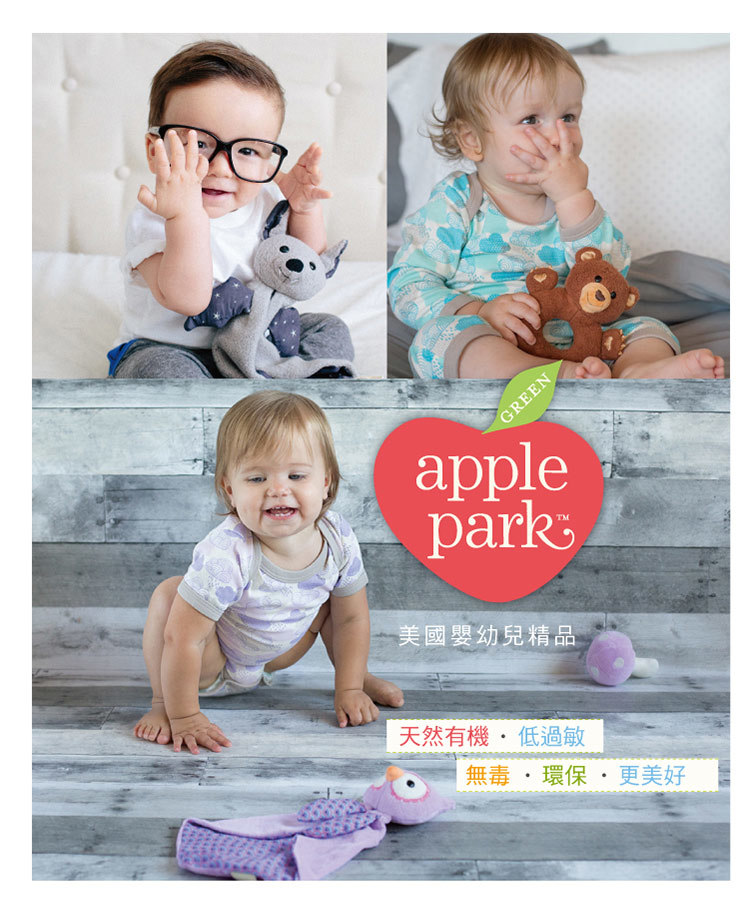 Apple Park 的產品除了注重寶寶安全和健康,更以多種可愛又有個性的動物為設計主題,搭配多元色彩製作,帶給寶寶安全感,同時給予多重感官刺激,幫助認知發展。