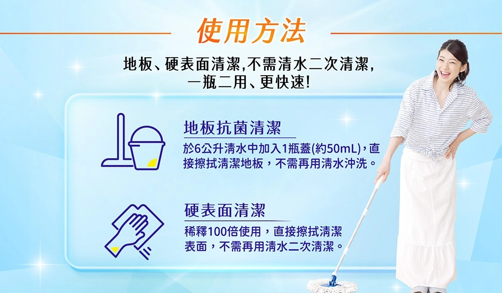 地板清潔、硬表面清潔一瓶兩用,適用各種地板與硬表面材質,如:磁磚、木質、大理石、磨石子,塑膠等