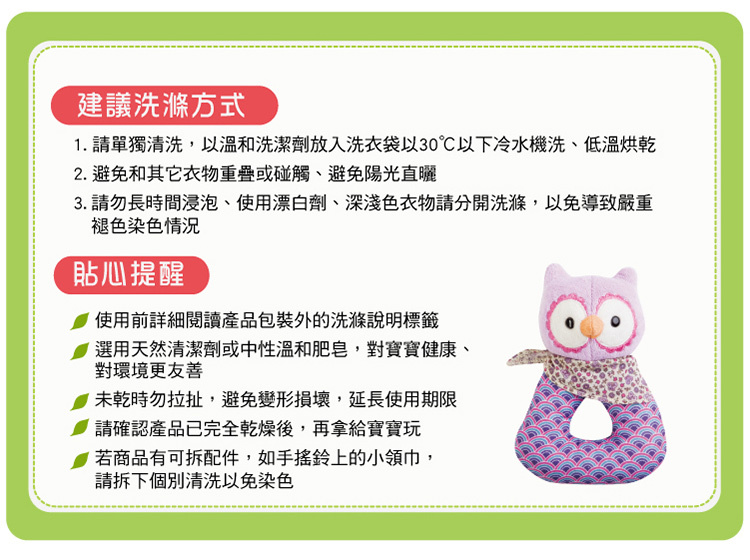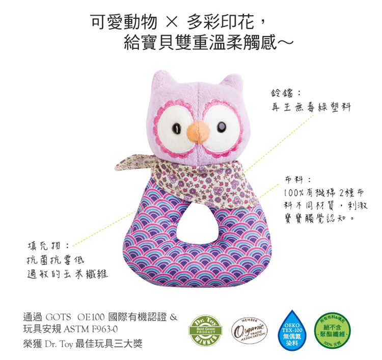 可愛的動物玩偶搭配細緻多彩的印花環形搖鈴、脖子上還繫了一條可拆卸的小領巾,不僅吸引寶寶注意,也給予視覺刺激;動物頭部和抓握的環形部分採用不同材質製作而成,給寶寶觸覺刺激,感受多重材質帶來的差異。