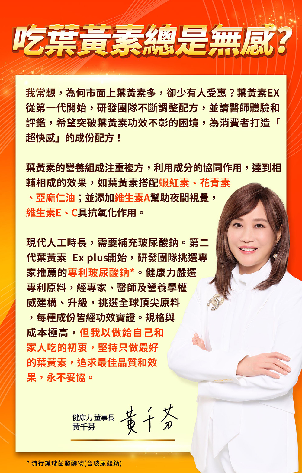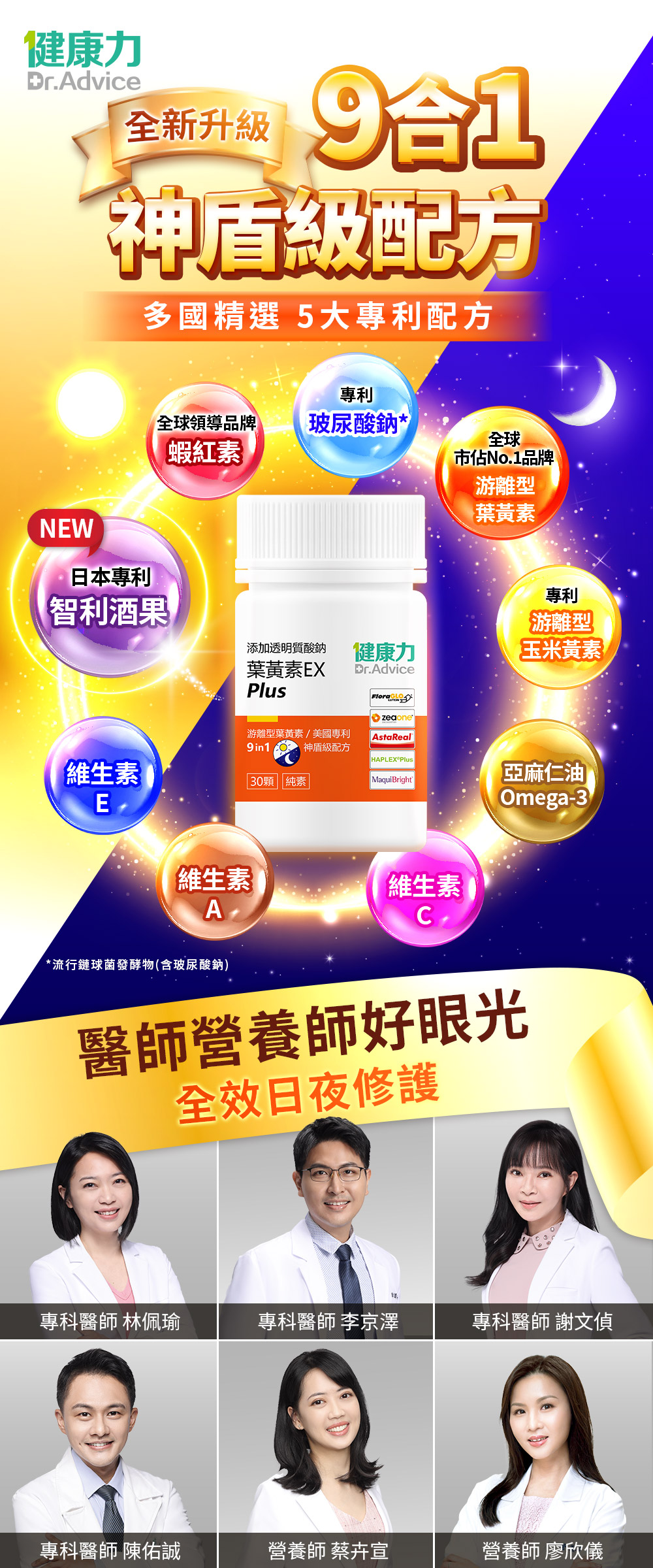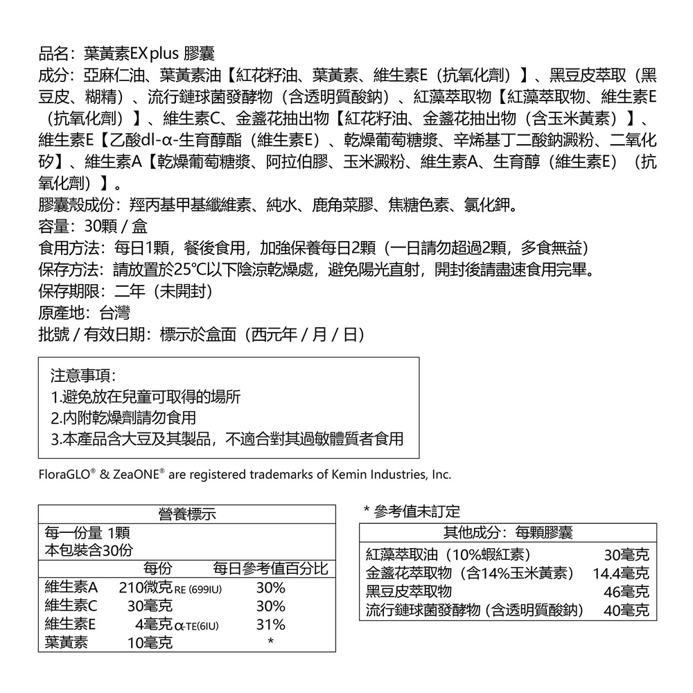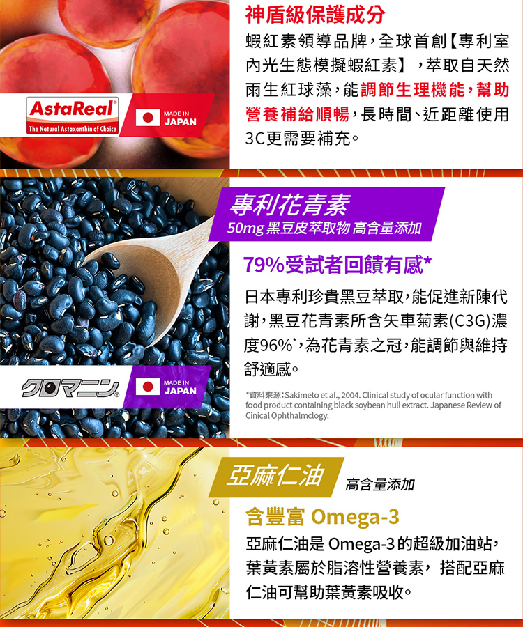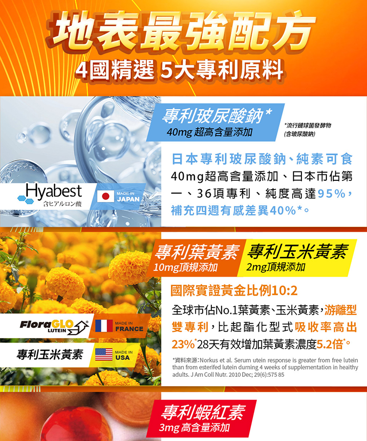 五大晶亮成分:透明質酸鈉(玻尿酸鈉)、葉黃素、玉米黃素、花青素、蝦紅素