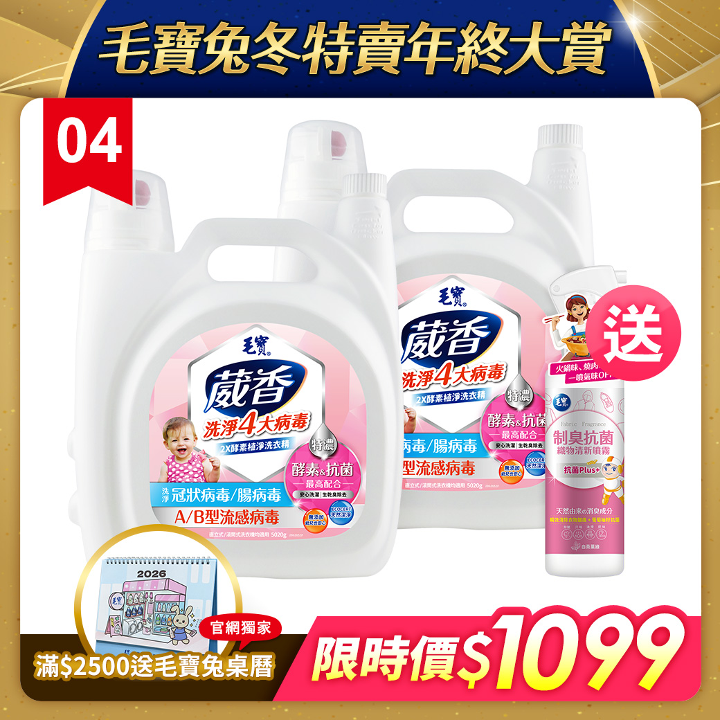 【毛寶】葳香洗淨病毒抗菌洗衣精-2X酵素植淨5020g x2 送毛寶制臭抗菌織物清新噴霧-瞬效除皺250g