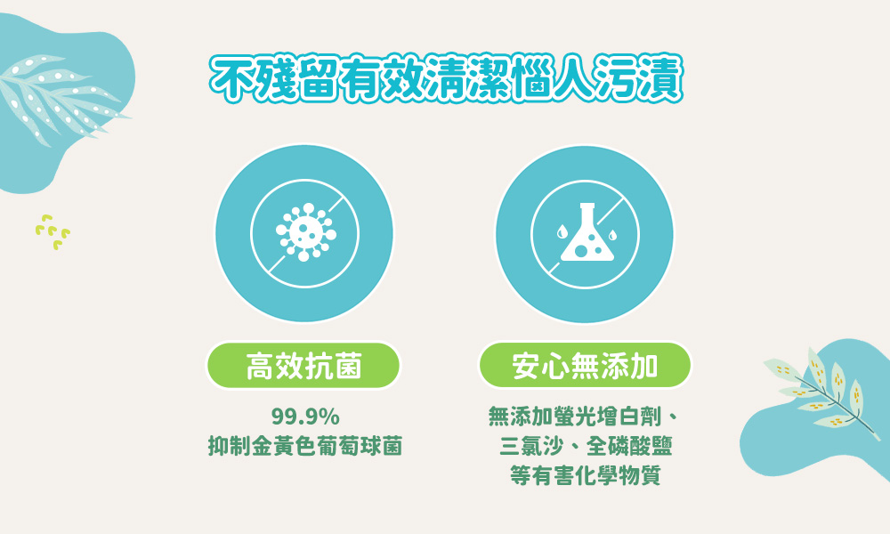 抗菌去漬雙效合一:99.9%洗淨金黃色葡萄球菌,有效抑制常見壞菌