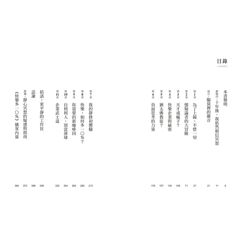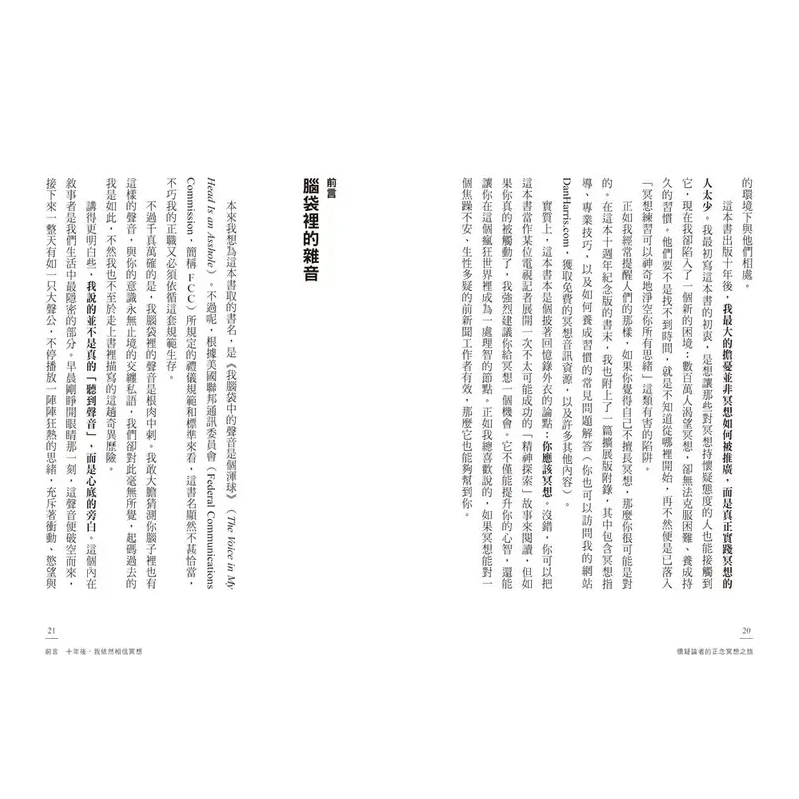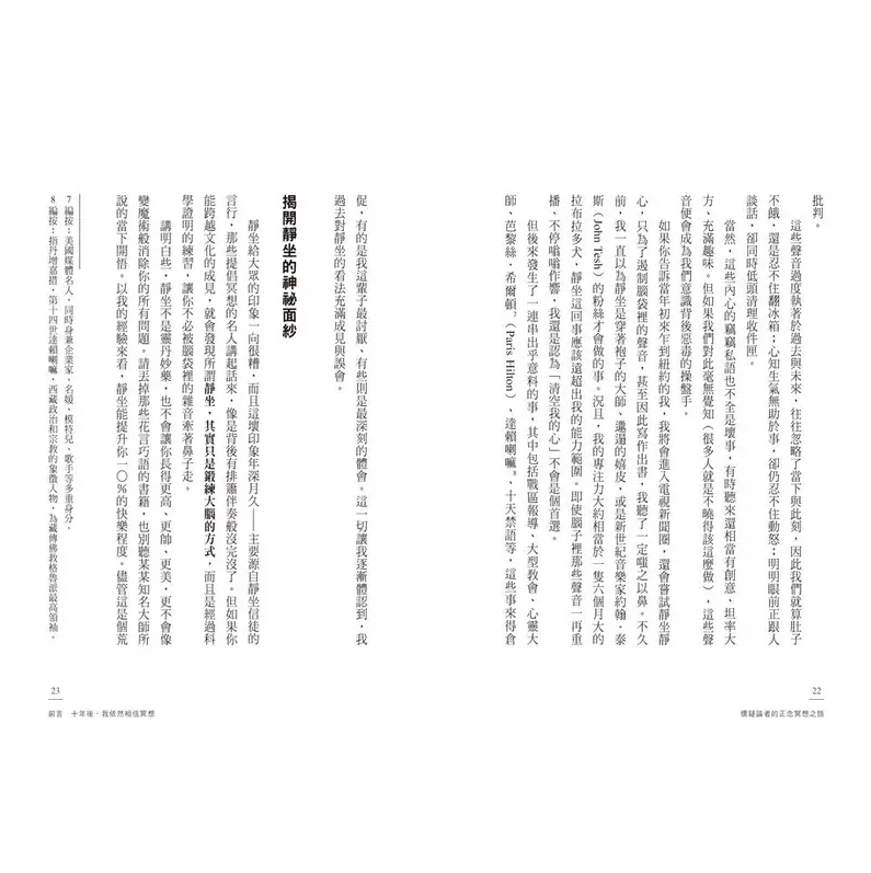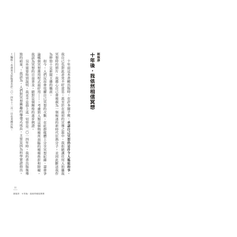 十年前這本書剛出版時,在許多圈⼦裡,承認自己冥想仍是件令人尷尬的事。我自己也對此非常不好意思,甚至於在最初的宣傳之旅中,我拒絕讓任何人拍攝我冥想時的照片。我擔心自己會被視為一個痴迷的新時代狂熱分子,並因此斷送我作為幹勁十足新聞主播的職涯。