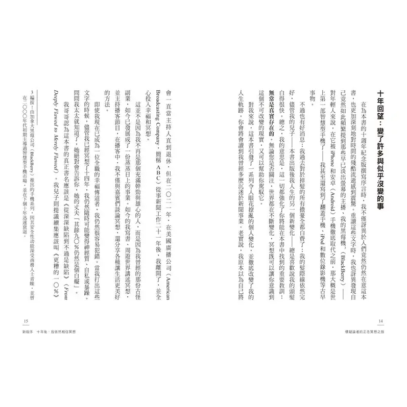 在為本書的十週年紀念版撰寫序言時,我不僅訝異於人們竟然仍然在意這本書,也更加深刻地對時間的殘酷流逝感到震驚。重讀這些文字時,我也訝異發現自己竟然如此頻繁提到那些早已淡出螢幕的主播、我的黑莓機 (BlackBerry)──對年輕人來說,在它被iPhone和安卓(Android)手機徹底取代之前,那大概是世上第一部智慧型手機了──我甚至還寫到了翻蓋⼿機、iPod和數位錄影機等古早事物。