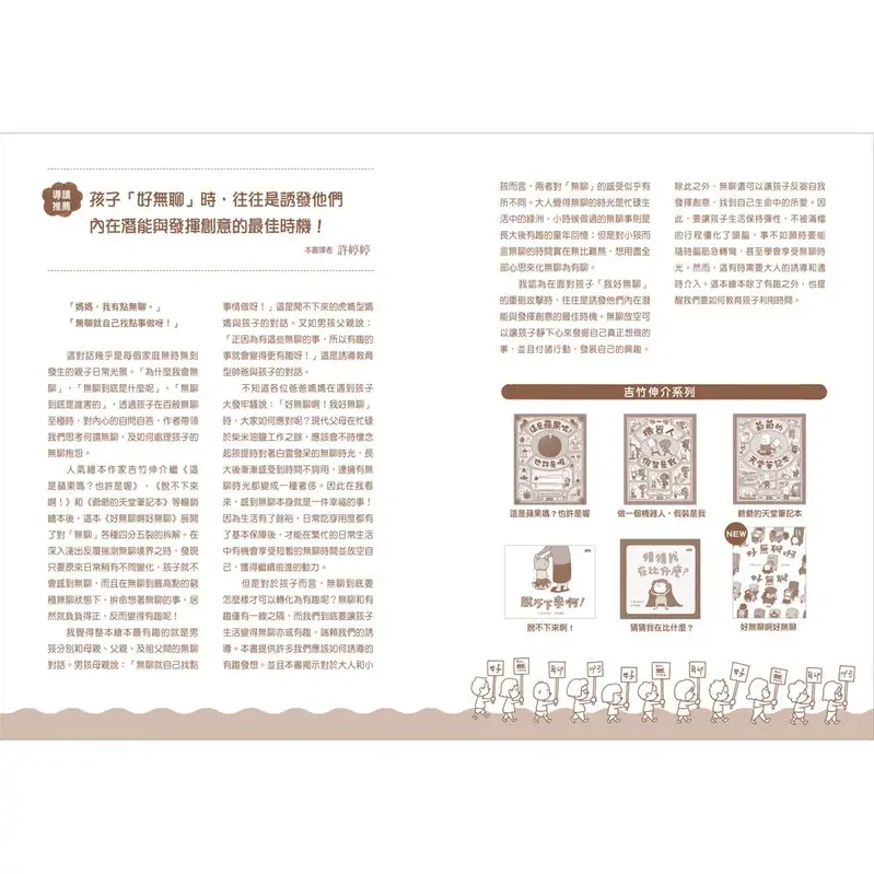 但是對於孩子而言,無聊到底要怎麼樣才可以轉化為有趣呢?無聊和有趣僅有一線之隔,而我們到底要讓孩子生活變得無聊亦或有趣,端賴我們的誘導。本書提供許多我們應該如何誘導的有趣發想。並且本書揭示對於大人和小孩而言,兩者對「無聊」的感受似乎有所不同。大人覺得無聊的時光是忙碌生活中的綠洲,小時候做過的無聊事則是長大後有趣的童年回憶;但是對小孩而言無聊的時間實在無比難熬,想用盡全部心思來化無聊為有聊。