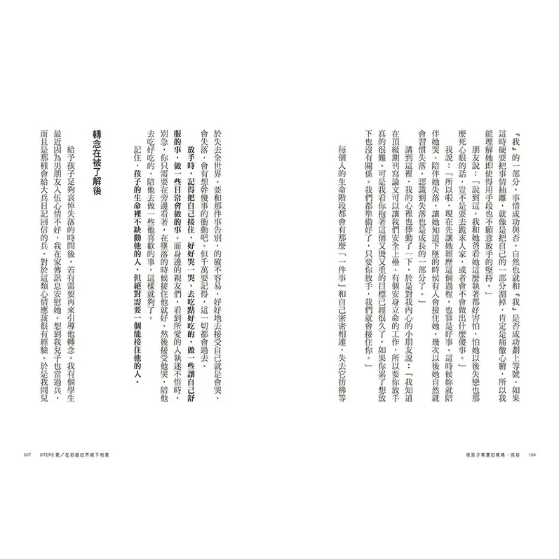給予孩子足夠哀悼失落的時間後,若有需要再來引導他轉念。我有個學生最近因為男朋友入伍心情不好,我在家傳訊息安慰她。想到我兒子也當過兵, 而且是那種會給大兵日記回信的兵,對於這類心情應該很有經驗。於是我問兒子,以一個過來人的身分,會給因當兵而分隔兩地的情侶什麼建議?