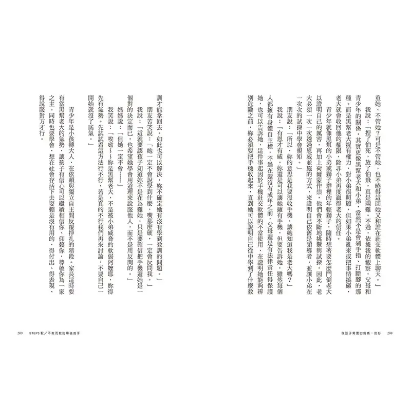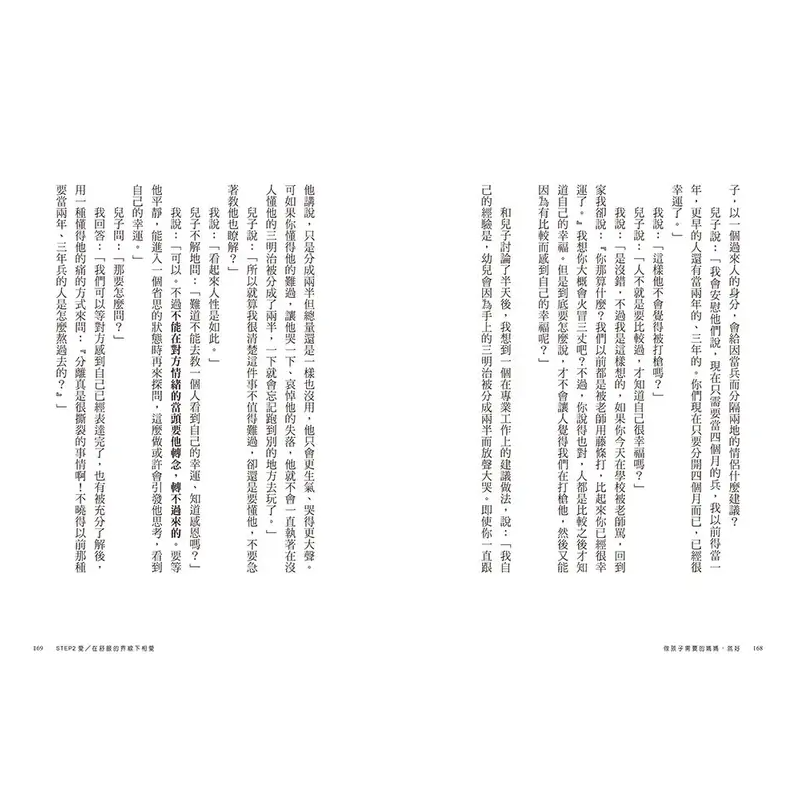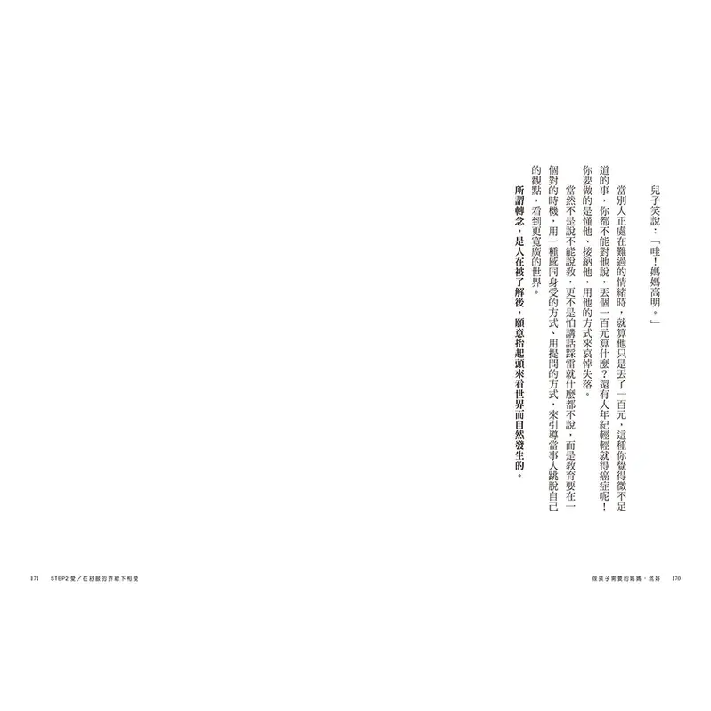 在這個我與兒子的日常對話中,我就像所有的媽媽一樣,聽到兒子碰到問題時,反射動作就是想幫他解決問題。但,等一下!聽!聽聽孩子說什麼?他需要我幫忙解決問題嗎?還是驚慌之時需要有人聽他說?如果我牛頭不對馬嘴地出手幫忙,會不會反倒好心沒好報,讓兒子感到不信任而不舒服?因此,我在第一章〈聽—正正地看著孩子〉談到聽見孩子的聲音與同理的重要性。