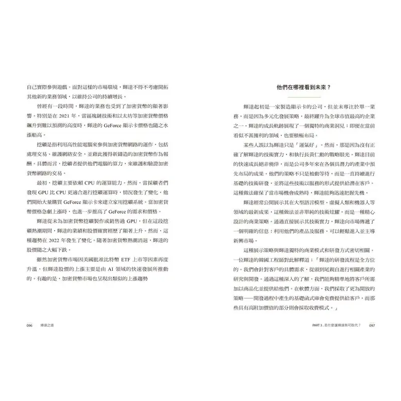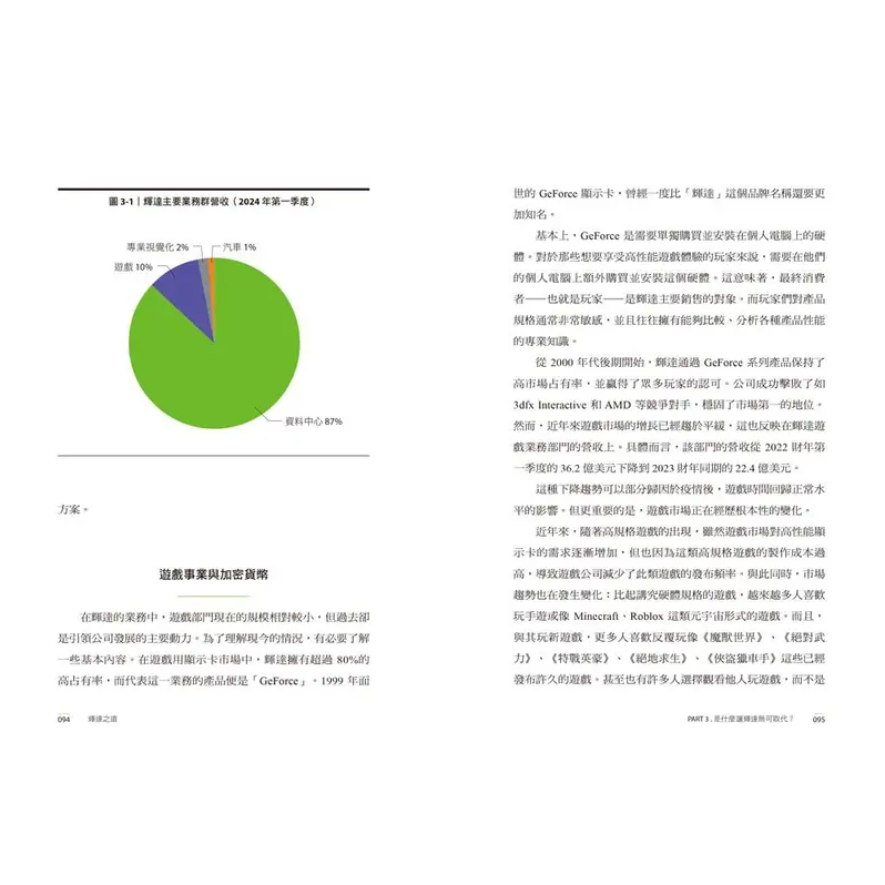 書中也深入探討資料中心業務以外的潛在增長點,並分析輝達在持續擴大的晶片戰爭中的未來戰略。