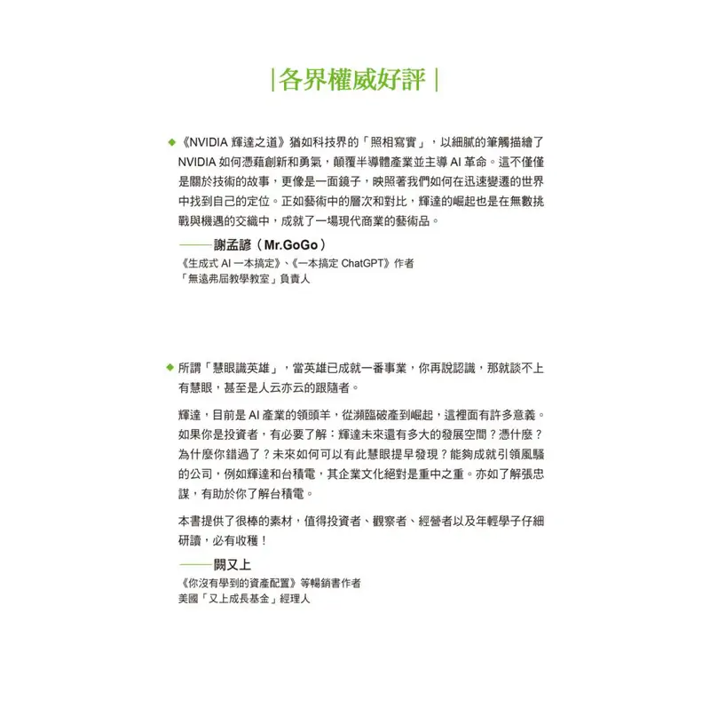 本書客觀分析當今 AI 巨頭輝達的發展歷程,讓讀者感受到他們的挑戰與奮鬥、淚水與榮耀。